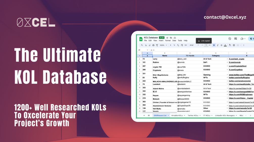 This database is more than just a list; it’s a gateway to building impactful relationships and amplifying your project's reach. With every detail at your fingertips, you can approach the right KOLs with confidence and clarity. Propel your Web3 venture forward with 0xcel’s Ultimate Web3 KOL Database—strengthen your project's influence today!